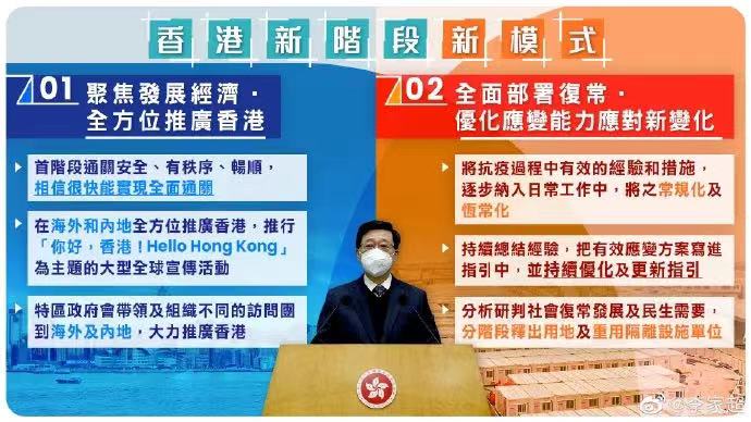 李家超表示,“随着周一(1月30日)正式撤销「隔离令」措施,我们对新冠疫情的管理,迈向新阶段、新模式,逐步建立新常态系统。目前,政府两大工作目标是聚焦发展经济,向海外及内地全方位推广香港,以及全面部署复常,把已优化和有效的应对方案常规化,并持续按实际情况优化应变能力,以应对新变化、新威胁。我有信心很快便能实现全面通关,政府将会与内地继续保持紧密联系,期望再有好消息公布。”